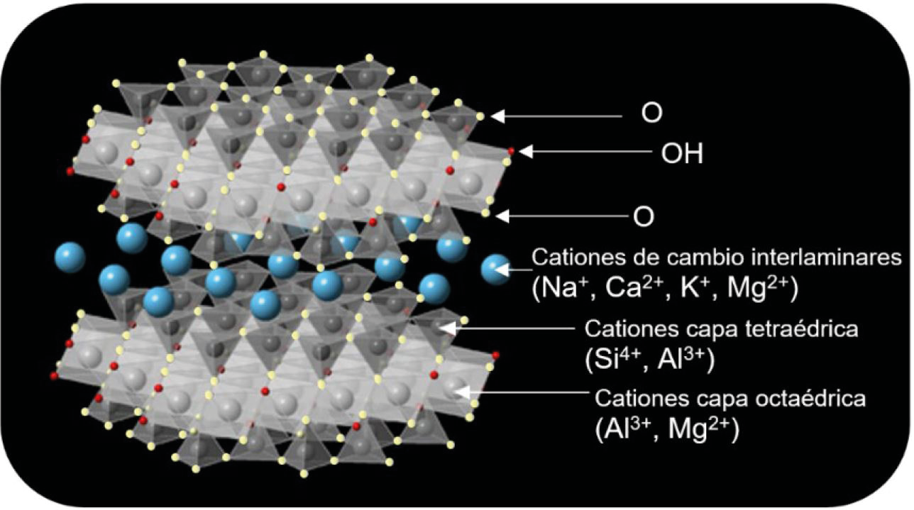 La montmorillonita (MNT) es una arcilla mineral multifuncional con una estructura laminar 2:1, en donde, una lámina está compuesta por una capa octaédrica de Al(OH)2O4 situada entre dos capas tetraédricas de SiO44-. En estas capas se producen sustituciones isomórficas, en donde, los cationes se susituyen por otros de tamaño similar de valencia baja, sin alterar la estructura, induciendo una carga negativa permanente; así, en la capa tetraédrica el Si4+ es sustituido por Al3+ y en la octaédrica el Al3+ por Mg2+. Esta carga negativa es compensada por cationes hidratados, alojados en el espacio entre cada lámina; lo cual confiere a la MNT la capacidad de hinchamiento y porosidad elevada por la adsorción de agua de acuerdo con la fórmula general siguiente (Schoonheydt, et al., 2018):