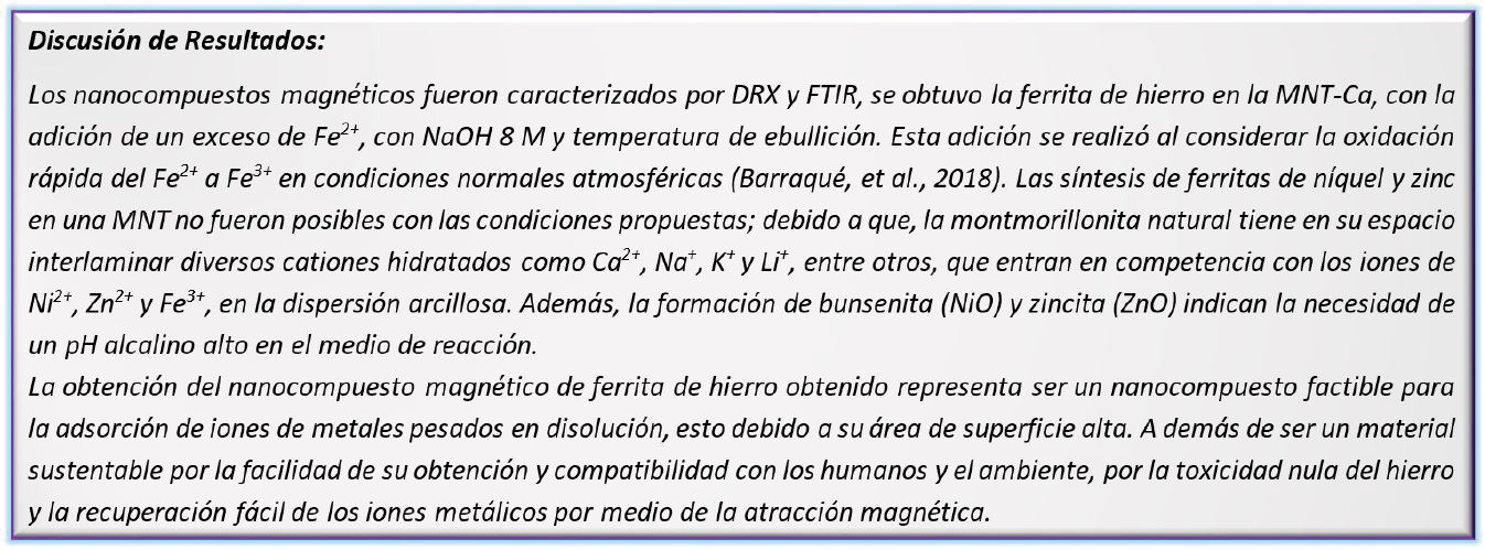 4) Demostraron la utilidad de las técnicas de DRX y FTIR en la caracterización de los materiales de partida; así como la consecución del nanocompuesto NPM-Fe/MNT sintetizado.