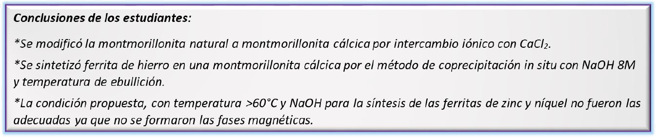 Los estudiantes, en 4 semanas, investigaron, desarrollaron los experimentos e interpretaron sus resultados. La transformación y los procesos de adsorción en las arcillas no son triviales, es un tema complicado, excluido de los programas de estudio (Berry, et al., 2006). En este tiempo, los estudiantes se esforzaron por comprender, la síntesis por coprecipitación y de forma simultánea, el ingreso de las fases magnéticas en la arcilla, por el proceso de adsorción interlaminar, en función de la estructura en la obtención del nanomaterial.