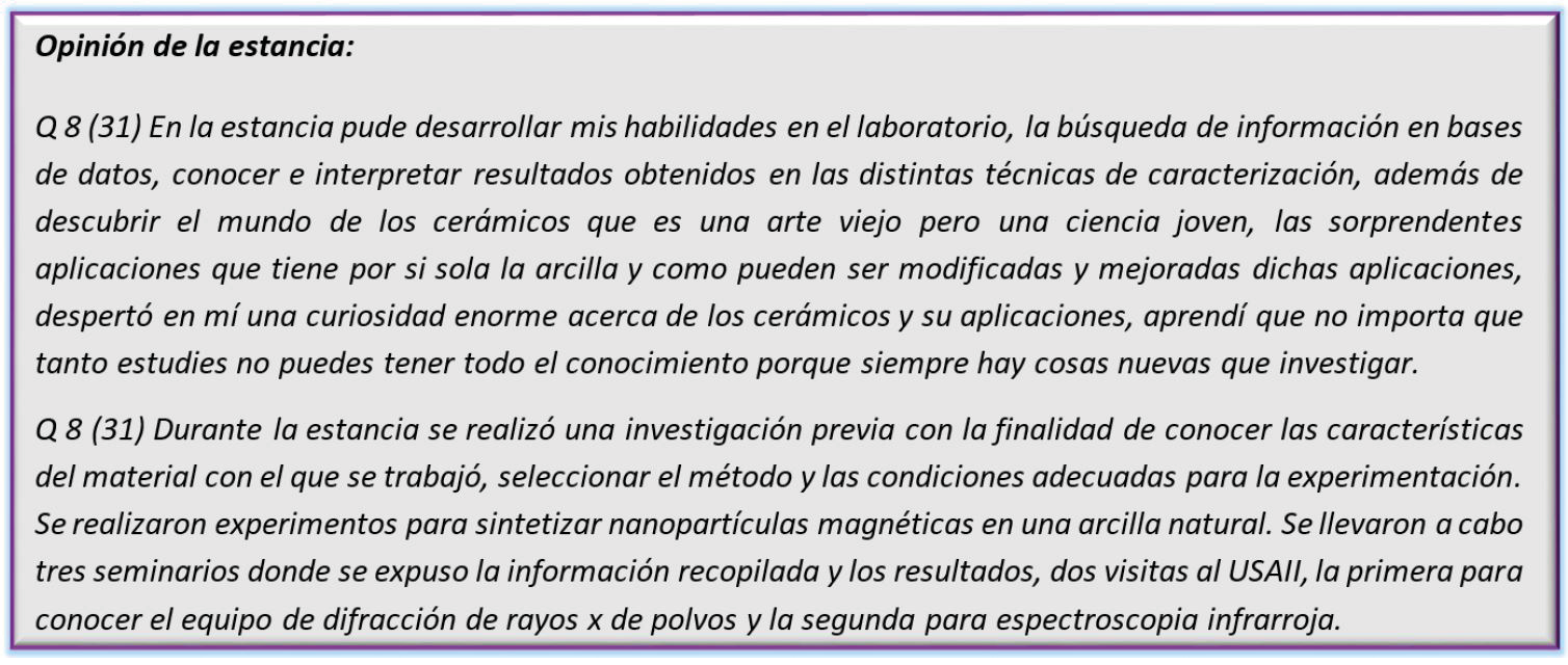 Finalmente, los estudiantes presentaron el desarrollo y los resultados de su propuesta en la Muestra Experimental, ante estudiantes de semestres distintos. El trabajo intersemestral se concluyó con la presentación en el Seminario del Laboratorio de Materiales Cerámicos y el escrito presentado ante el departamento del Subprograma 121 de Estancias Cortas de Investigación de la Facultad de Química, en donde, se obtuvo el tercer lugar, en la categoría de Química, con el nombre de “Arcillas intercaladas”.