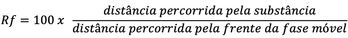 Distância percorrida pela substância dá-se do ponto de aplicação da amostra até o centro da mancha revelada, enquanto que a distância percorrida pela frente da fase móvel caracteriza-se pela distância percorrida pela fase móvel da linha de partida (ponto de aplicação) até que sua frente atinja a linha de chegada presente na parte superior da cromatoplaca (UNODC, 2012).