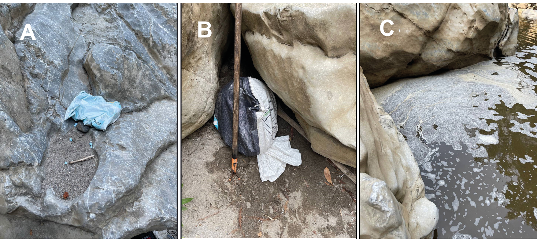 Figura 3. A) Bolsa de detergente, B) Bolsa de basura y C) Agua contaminada.