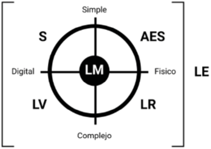 Según Idoyaga, (2022), a nivel didáctico incluye el uso de Actividades Experimentales (AES) o caseros, simuladores, Laboratorio Móviles (LM), Laboratorios Virtuales (LV), Laboratorios Remotos (RM) y otras tecnologías. Además de potenciar las actividades experimentales en los Laboratorios Tradicionales Presenciales o Laboratorios Hand On y el Trabajo de Campo. En conclusión, los distintos elementos que integran LE, pueden clasificar dependiendo de la complejidad de las prácticas, y además si se utiliza actividades presenciales o digitales, tal y como se puede ver en la Figura 1, el cual muestra las dos secciones, simple-complejo y físico-digital.