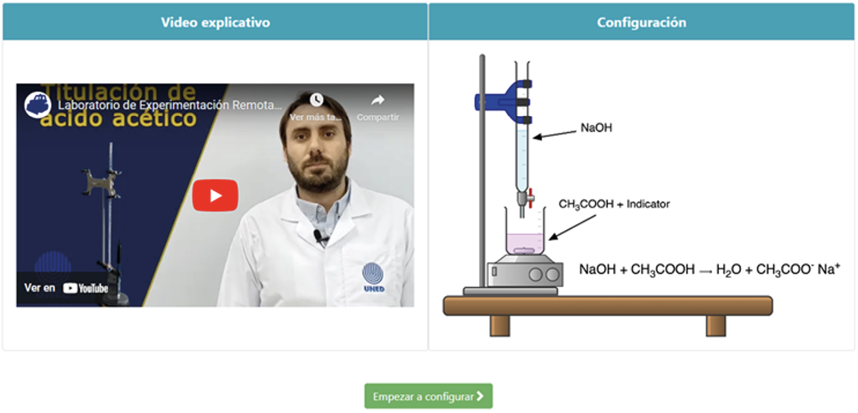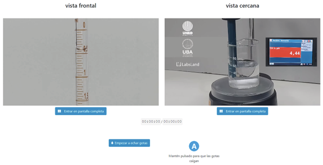 El LR-VAB, se basa en uno de los métodos volumétricos de análisis, donde se realiza una reacción de neutralización (Montero-Miranda, 2022). En el LR, los estudiantes deben de ingresar a través de un enlace de LabsLand (plataforma de gestión de acceso), donde se registran y pueden acceder al LR-VAB. Una vez que ingresan al espacio al trabajo del LR, se presentan tres secciones (introducción, configuración y observación). En la introducción, el estudiante tiene a disposición un diagrama del experimento, además de un video que explica la experiencia, armado del equipo y algunos conceptos clave. En la sección de configuración el estudiante puede elegir entre dos modalidades del experimento (colorimétrica y potenciométrica), según se plantee en la actividad diseñada por el profesor. En esta misma sección puede escoger entre dos concentraciones de valorante de Hidróxido de Sodio (NaOH) de concentración conocida, además de tres posibles muestras de concentración desconocida de vinagre.