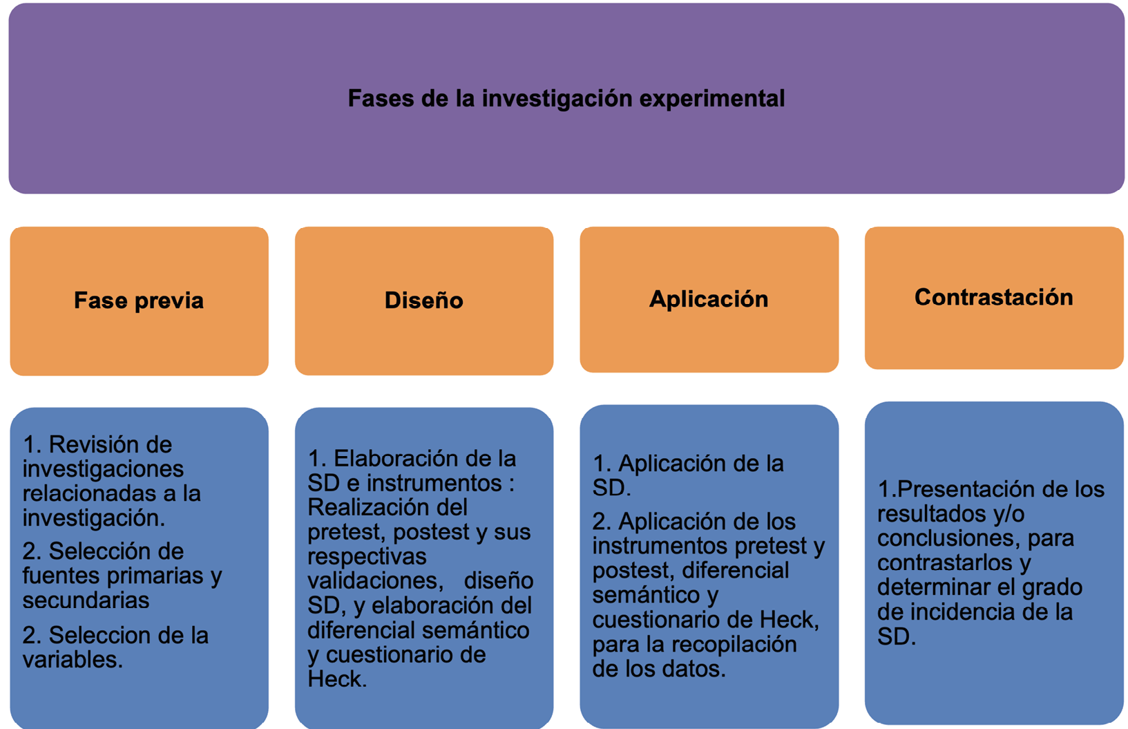 Figura 4. Descripción de las fases de la investigación experimental. Nota. La figura evidencia las fases de la investigación y su descripción. Elaboración propia, 2023.
