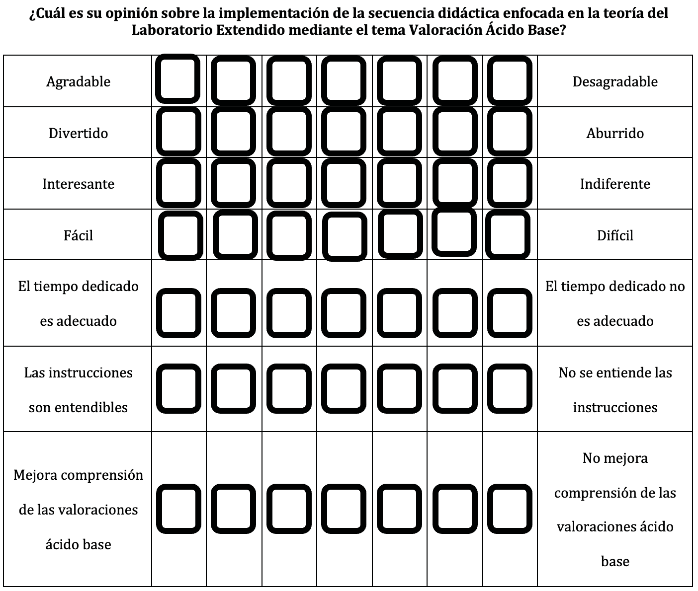 Se aplicaron adjetivos a elementos en una escala de intervalos para luego ser analizados por análisis factorial. En este caso la escala se manejó en siete (7) puntos cuyos extremos están asociados con etiquetas bipolares con carácter semántico. Estas etiquetas son: desagradable/agradable; aburrido/divertido; indiferente/interesante; fácil/difícil; tiempo adecuado/tiempo insuficiente; instrucciones entendibles/instrucciones confusas; compresión de conceptos/confusión de conceptos. Según la es cala se manejó de la siguiente forma: 1 a 3 para atributos negativos; 4 valor neutral y de 5 a 7 para atributos positivos.