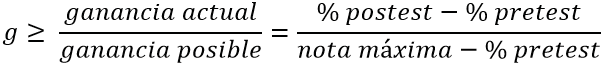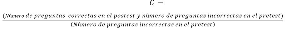 Por lo tanto, el factor de Dellwo, determina la ganancia normalizada que mide la probabilidad de que un error en la prueba previa a la instrucción de un grupo se corrija en la prueba posterior a la instrucción, esta ganancia se denomina “G” y se obtiene a través de la ecuación (2):