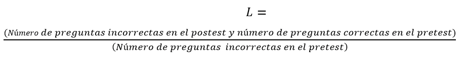 De igual manera, permite reconocer una pérdida normalizada “L” que mide la probabilidad de que una respuesta correcta en la prueba previa a la instrucción del grupo se vuelva incorrecta en la prueba posterior a la instrucción, mediante la ecuación (3):