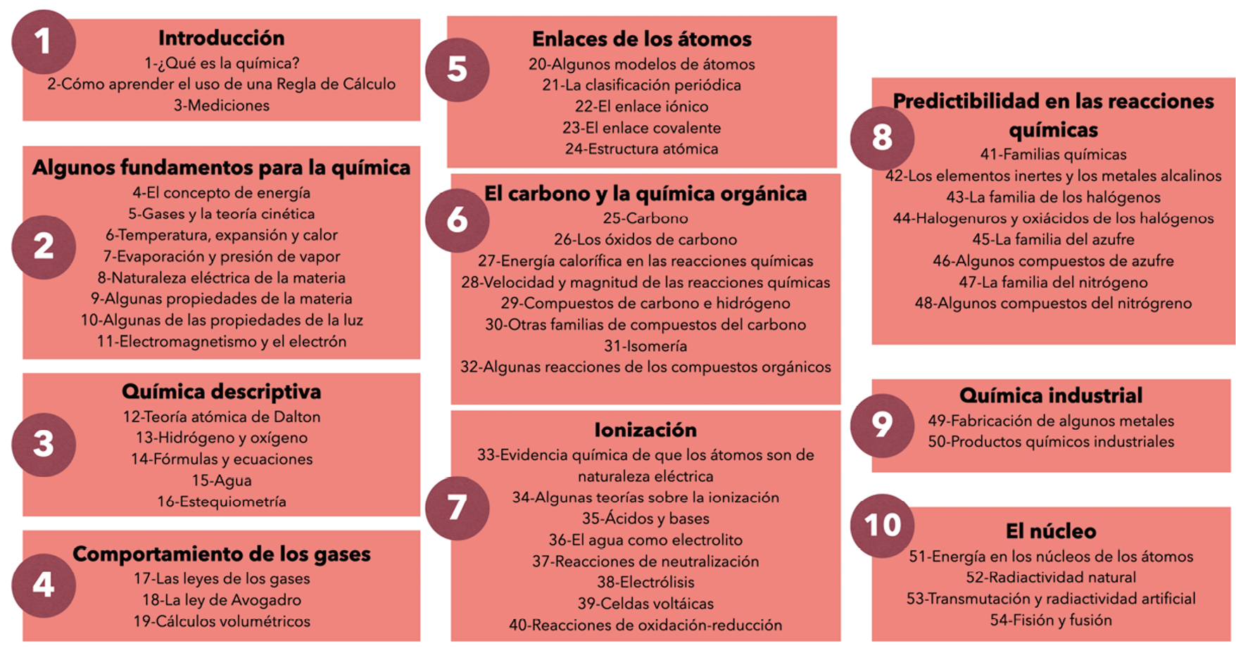 No obstante, ambos proyectos presentan diferencias notables. Así, Química, un enfoque moderno aboga por innovar en la didáctica de la química a través de la actualización de los saberes escolares en base a las nuevas investigaciones procedentes de la disciplina, con especial atención a la mecánica cuántica. Al igual que Sistemas Químicos, se promueve la experimentación con un manual de laboratorio que acompaña al texto. No obstante, Química, un enfoque moderno ofrece una secuenciación y organización del currículo diferente. Los diez bloques que lo componen, recogidos en la Figura 3, obedecen a la estructuración propia del saber químico académico. Tras dos bloques introductorios se incorporan la química descriptiva, el estudio de los gases, el estudio del enlace químico, la química orgánica, la química analítica, la química física, la química industrial y la química nuclear. Cabe subrayar que mientras que la química de las décadas de 1950-1970 experimentaba una importante actualización en el marco de la química analítica instrumental (Chamizo, 2017); la actualización del currículo químico escolar se centró en saberes ya consolidados en décadas anteriores (como el desarrollo de la teoría cuántica o los fundamentos de la química analítica), una clara muestra de los dilatados procesos de transposición didáctica de los saberes científicos expertos en saberes científicos escolares. La didáctica de la química contribuiría así a presentar al alumnado los saberes sólidos y consensuados propios de la ciencia normal kuhniana (van Barkel, 2000).