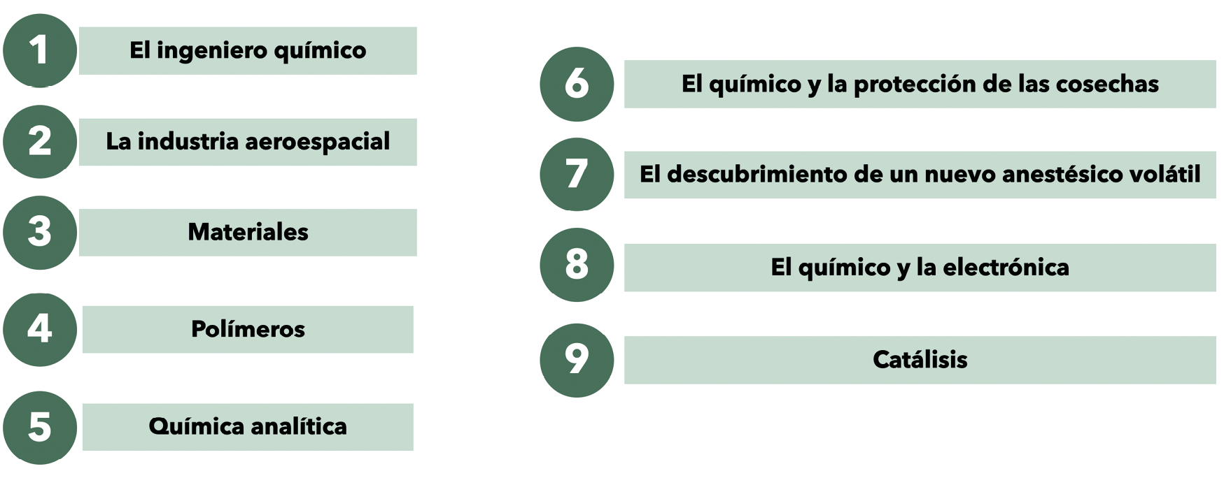 Si Química, un enfoque moderno estaba dirigido a alumnado que se inicia en el aprendizaje de la química, el proyecto El químico en acción se dirigía a estudios más avanzados, tanto de últimos cursos de enseñanzas preuniversitarias como de los primeros cursos universitarios. Se trata de un proyecto impulsado por la Fundación Nuffield, institución nacida en 1943 en Reino Unido comprometida con la mejora social a través de la educación que abogó por atraer a los mejores estudiantes hacia la ciencia (Chamizo y Pérez, 2017). Como se aprecia en la Figura 4, en el proyecto El químico en acción la presentación, selección y secuenciación de los saberes químicos escolares se realiza atendiendo a diferentes áreas de interés en la época para la profesión química, como la ingeniería química, la industria aeroespacial, la industria electrónica, la ciencia de materiales, los métodos analíticos, la química agrícola y la química médica. Cobra especial interés la presencia de cuestiones como las nuevas técnicas analíticas instrumentales (como la cromatografía de gases o los espectrofotómetros, entre otros) o la importancia de los compuestos de coordinación y organometálicos para la catálisis. Se trata de aspectos destacados de la práctica química de la época (Chamizo, 2017). A diferencia de los cursos introductorios, como Química, un enfoque moderno, donde los saberes curriculares distaban de los saberes emergentes proporcionados por la investigación química, en el caso de este curso avanzado sí se aprecia una rápida transposición didáctica del saber experto en saber escolar.