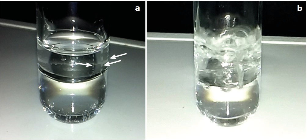 Figure 1. Two-layer water-cyclohexane liquid system under heating (upper layer is cyclohexane). Interface bubbling begins (a), as indicated by the arrows, and more energetic bubbling (b).