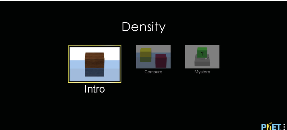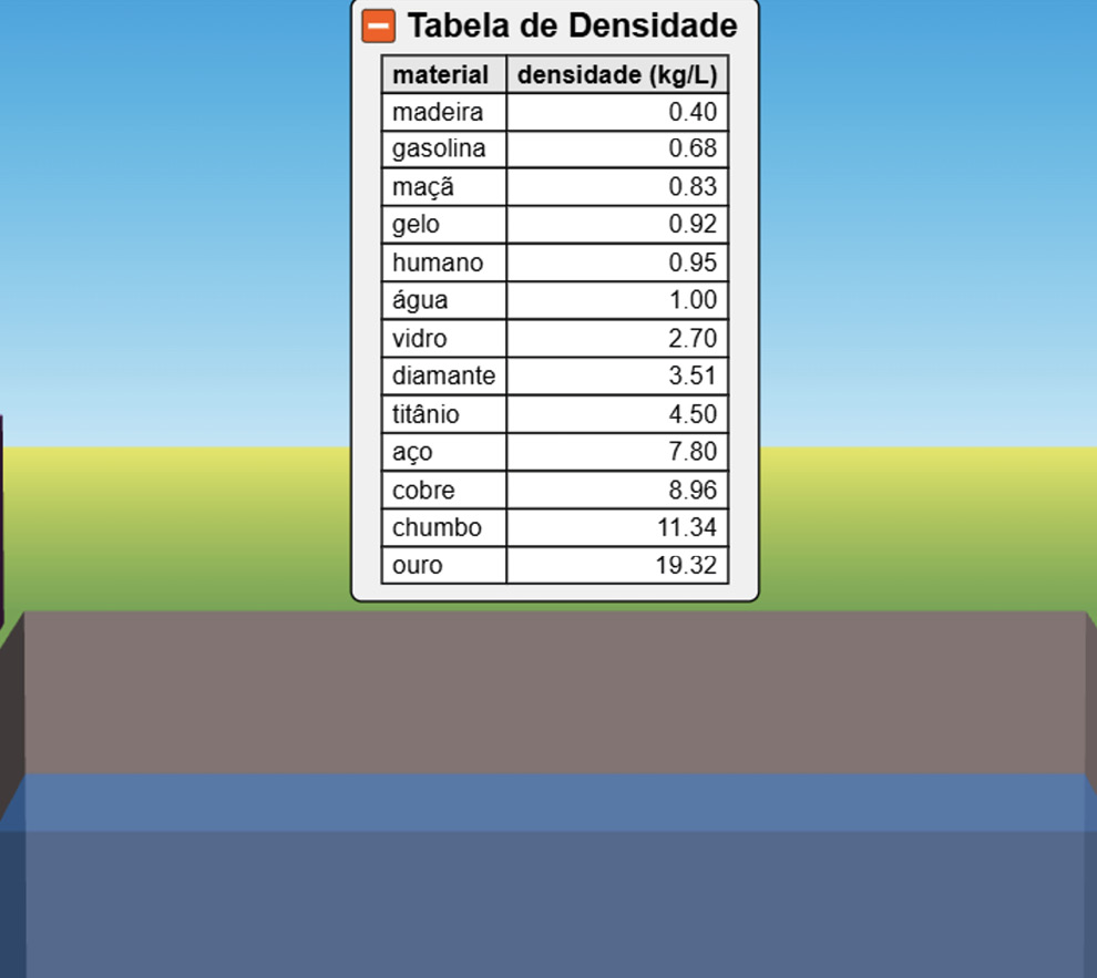 La tabla de densidad presentada en la simulación posibilita al estudiante realizar una comparación y evaluación de las diferencias de densidad entre los diversos materiales. El enunciado de la actividad solicita al estudiante que evalúe los diferentes entornos en los que los objetos pueden flotar o hundirse. |
