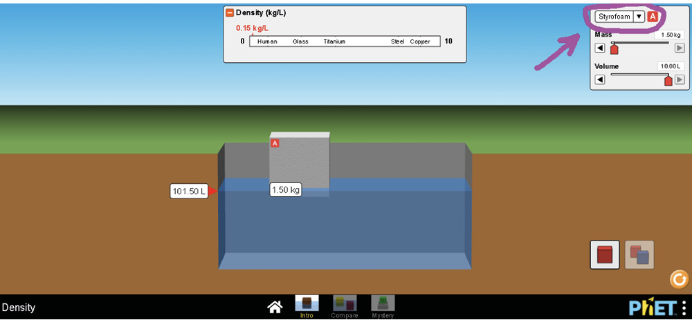 “Ingresa a la actividad llamada Intro, elige un material de su preferencia, al costado de la pantalla”. Ahora juega un poco con su masa y volumen”. |