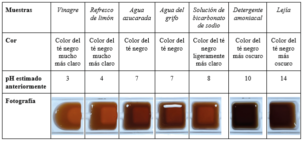 Nota 1: Dado que los cambios en la tonalidad del color del té negro observados son muy tenues, en lugar de agregar unas gotas de té negro a las muestras, fue necesario agregar solo unas gotas de las muestras al té negro para que estos cambios fueran observados.