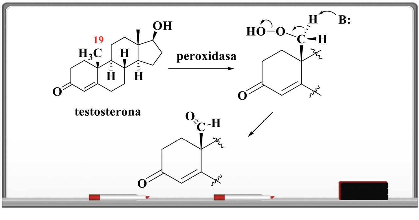 En la testosterona hay un metilo, la transformación de testosterona-estrona está estudiada con una minucia impresionante usando marcajes isotópicos (Caspi et al, 1984), cálculos computacionales (Sen y Hackett, 2012), entre otras cosas. Se sabe que una peroxidasa inicia la reacción con alguno de los tres hidrógenos del metilo, esta enzima adiciona un hidroperóxido al metilo del C-19, generando que los hidrógenos en él se vuelvan diastereotópicos. El siguiente paso es la oxidación del hidroperóxido al aldehído de forma específica con el hidrógeno α y una base toma el protón formando el aldehído en C19 y eliminado el ion hidróxido, este mecanismo se ha estudiado con marcaje con deuterio (Pizarrón 8) (Yoshimoto y Guengerich,2014).