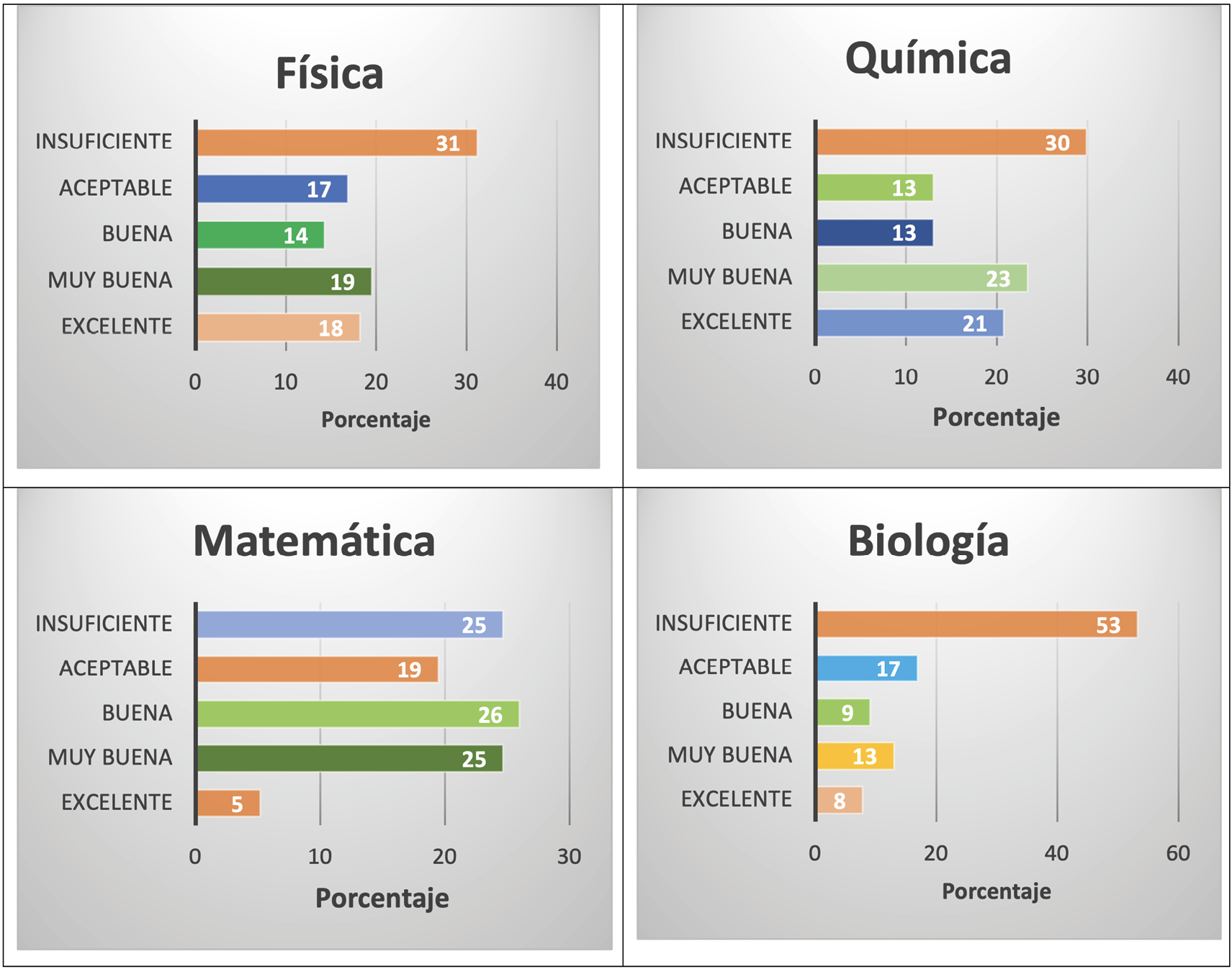Como resultado del estudio, se observa que la mayoría de los encuestados considera que su formación en el nivel medio fue insuficiente o apenas aceptable. La asignatura con mayor porcentaje de percepción “insuficiente” fue Biología, lo que puede atribuirse al hecho de que esta disciplina solo se imparte en el plan específico del Bachillerato Científico con énfasis en Ciencias Básicas, y no en otras modalidades o especialidades de los bachilleratos técnicos.