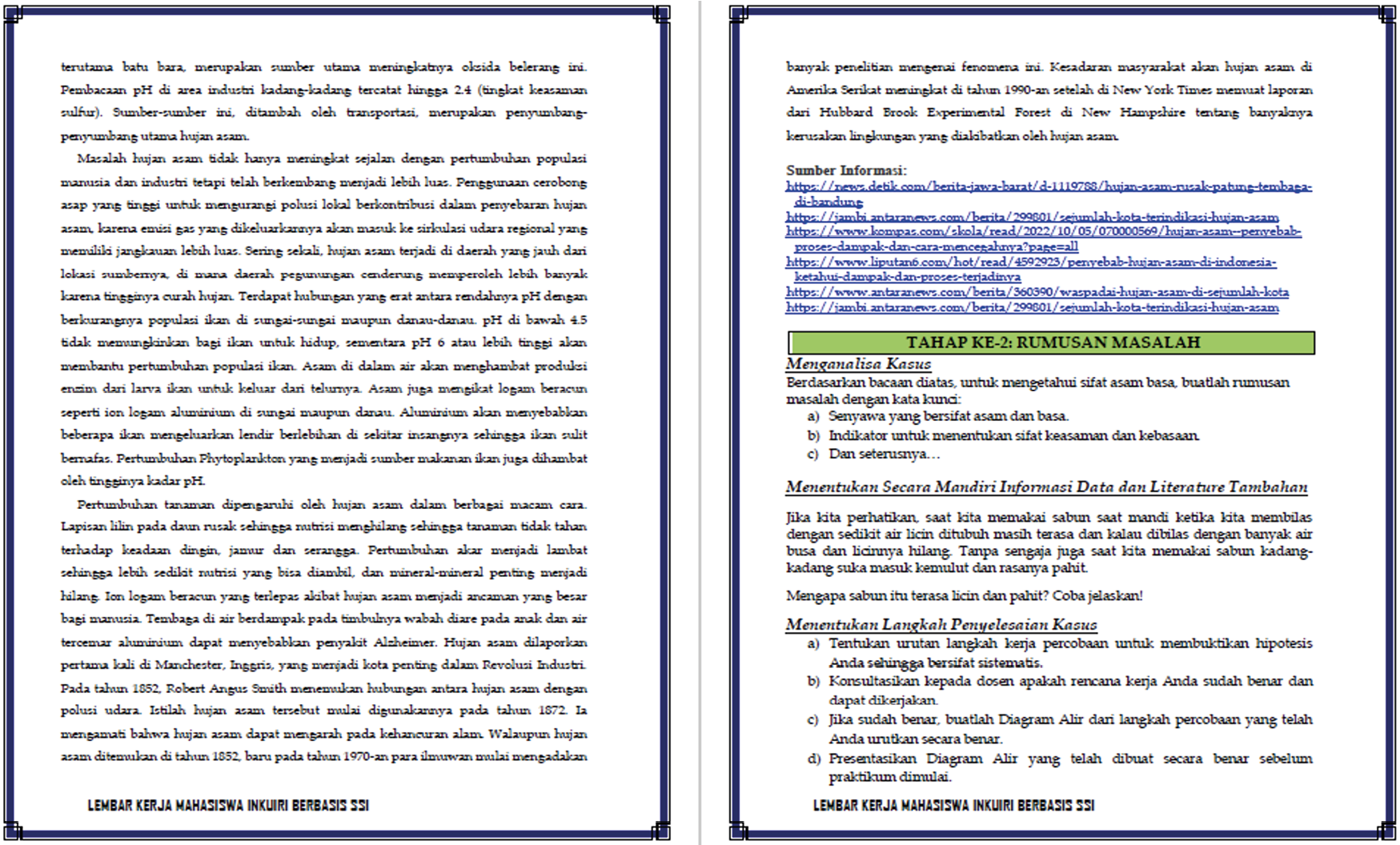 One promising approach is the inquiry learning model based on socio-scientific issues (SSI), which can improve students’ argumentation skills and foster multiple perspectives (Wahono et al., 2021). SSI-based inquiry allows students to independently build knowledge, supported by educators, through real-world social science issues (Hwang et al., 2023). It addresses complex, open-ended social problems, helping students contextualize chemical concepts within societal issues and thereby enhancing chemical literacy (Sulistina & Hasanah, 2024). SSI inquiry not only improves scientific understanding but also encourages ethical, moral, and civic engagement in science education (Çalik & Wiyarsi, 2024). It fosters motivation and analytical thinking by enabling students to explore scientific controversies and their societal implications (Avsar Erumit & Yuksel, 2023; Şaşmazören et al., 2023).