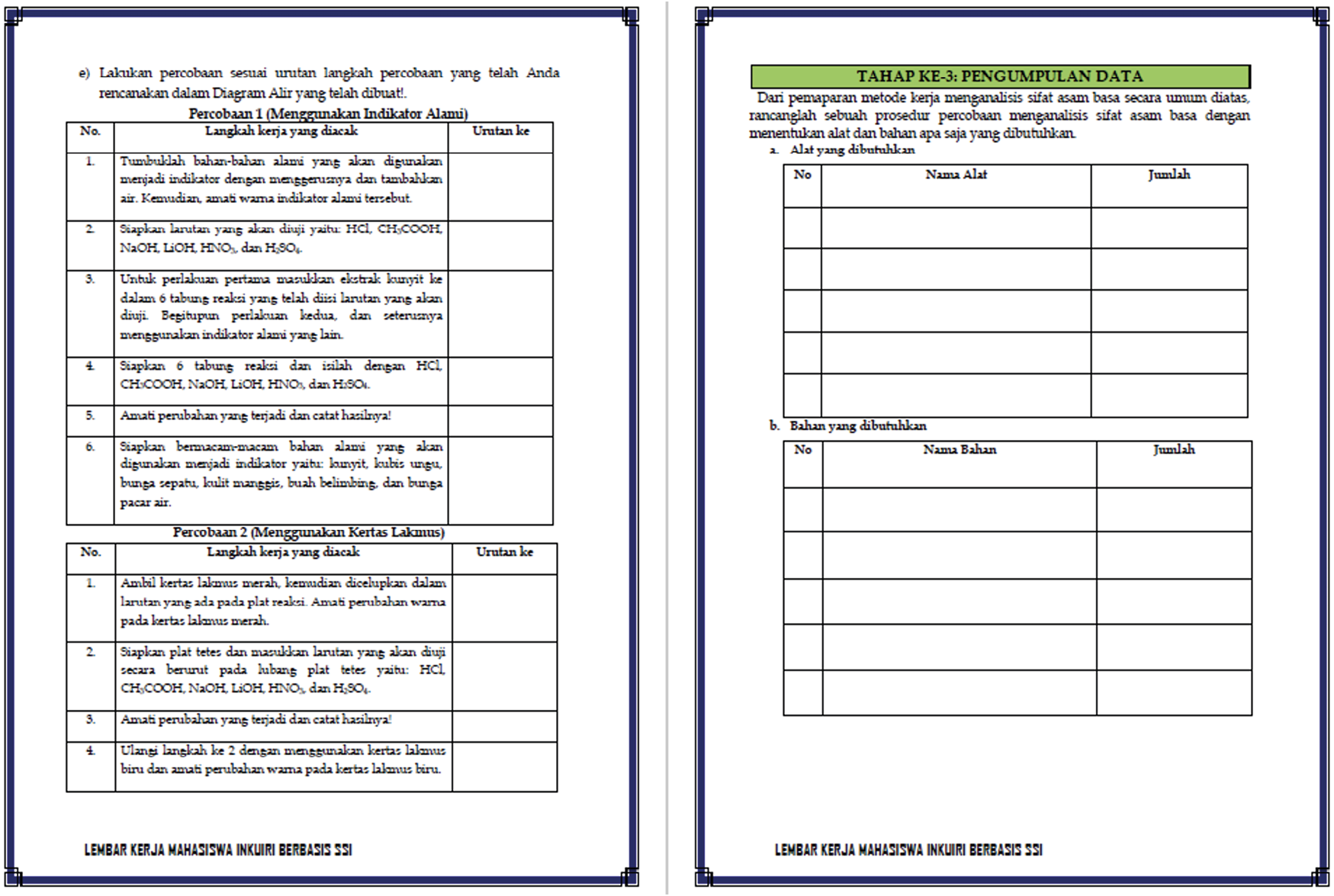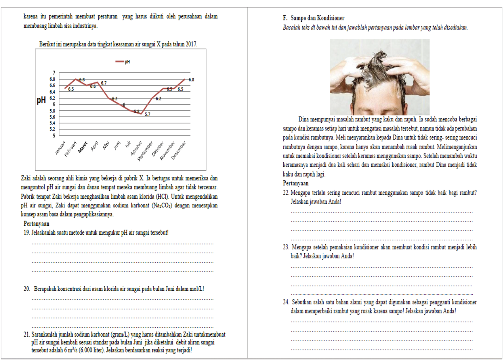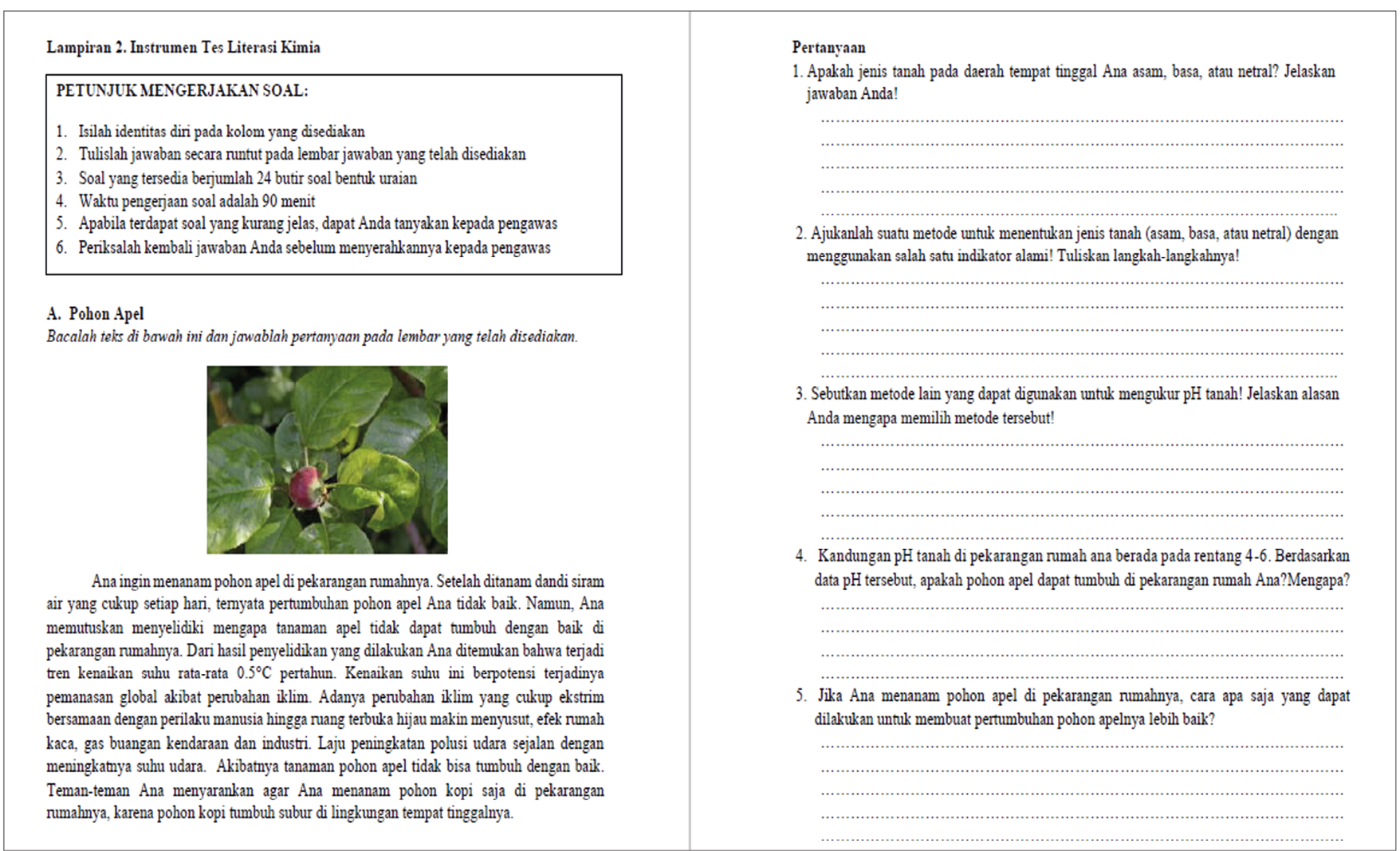 The study utilized two types of instruments: treatment instruments and measurement instruments. The treatment instruments—used during the teaching and learning activities—included the learning syllabus, semester learning plans, and student worksheets (see Appendix 1). The measurement instruments consisted of test items designed to assess students’ chemical literacy skills. These items were developed by the researchers based on established indicators of chemical literacy.