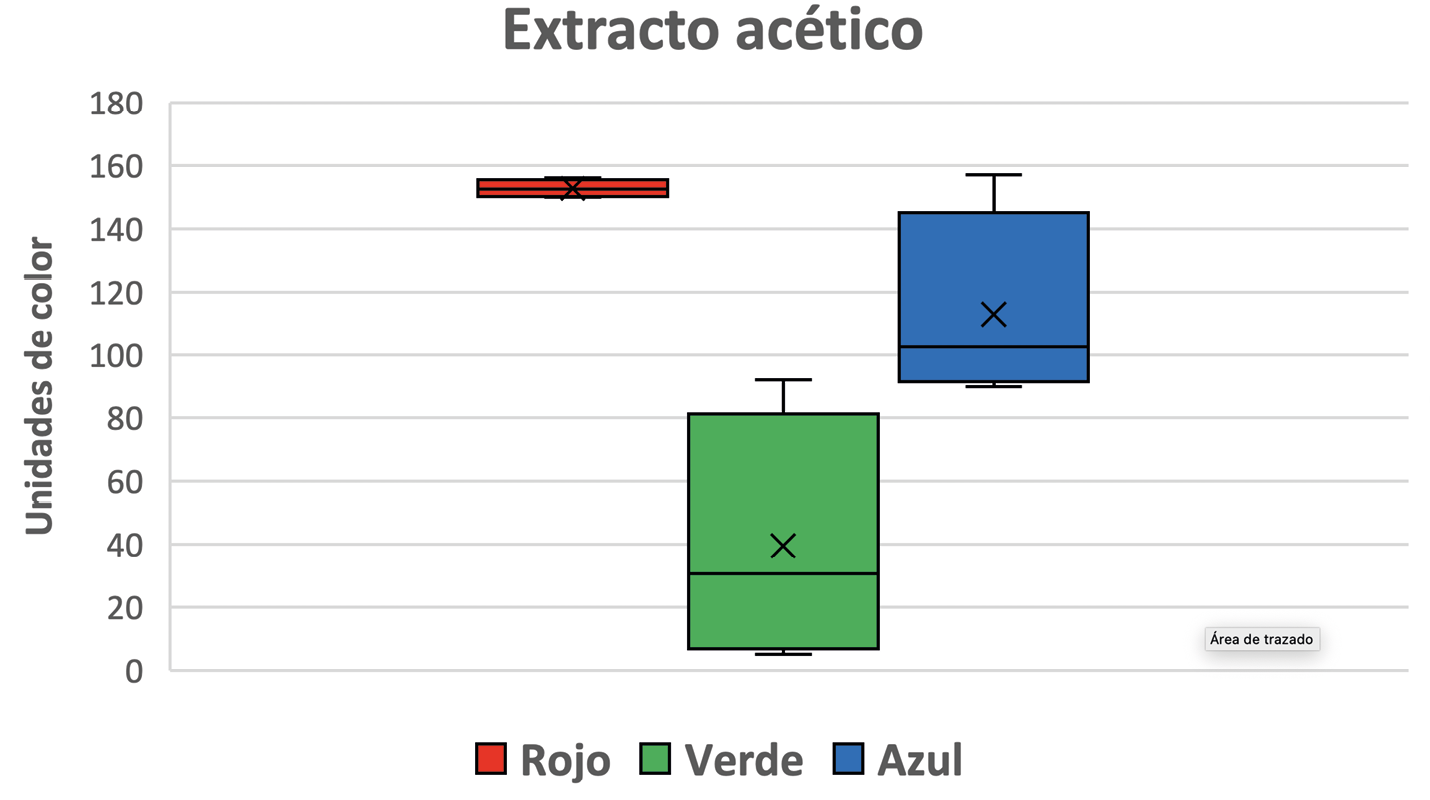 Las reacciones de decoloración se realizaron sobre extractos frescos sin tratamiento adicional. Se recomienda llevar a cabo los ensayos inmediatamente, ya que el extracto alcohólico pierde intensidad en 48 h, a diferencia del acético.