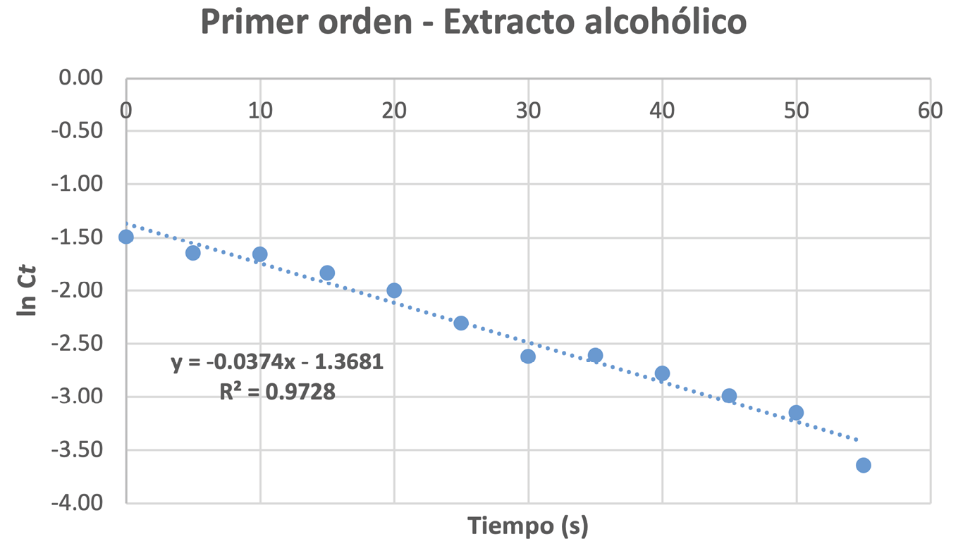 Se observó que, para los tiempos de reacción estudiados, la decoloración era rápida en ambos extractos. Hasta los 80 s, la gráfica Ct vs. t del extracto acético mostraba un comportamiento lineal, alejándose ligeramente de la tendencia en los últimos puntos. En cambio, la gráfica ln(Ct) vs. t del extracto isopropílico evidenció una tendencia lineal más persistente.