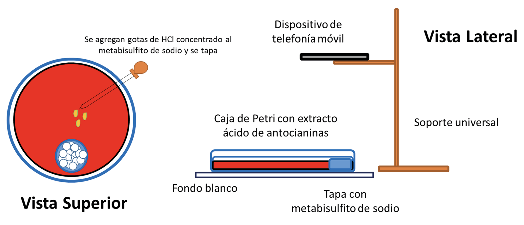 Como recipiente de reacción se utilizó una caja de Petri de vidrio (10 cm de diámetro) con 20 mL de extracto y una tapa pequeña (~2 cm³) que contenía ~250 mg de metabisulfito de sodio. Se registraron los parámetros de color R (rojo), G (verde) y B (azul) mediante la aplicación Carolina® RGB Colorimeter, utilizando el dispositivo móvil colocado sobre un aro fijado a un soporte universal, a ~40–50 cm de altura. La cámara enfocó una placa de teflón (15 cm × 15 cm) como fondo, sobre la cual se colocó la caja de Petri.