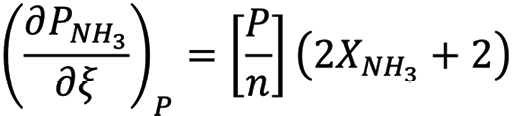 Donde Pj, nj y νj representan presión parcial, cantidad de moles y coeficiente estequiométrico, respectivamente, y ξ es el grado de avance. Para el amoníaco, con νN₂ = –1 y Σν = –2: