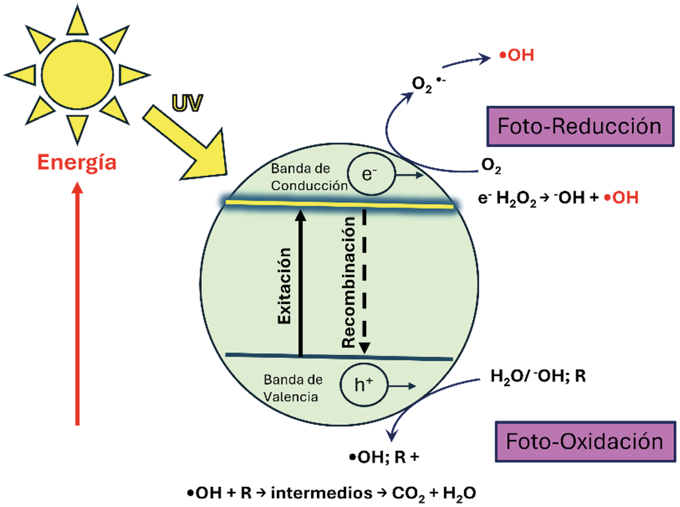 Cuando el TiO₂ es irradiado con luz UV, se promueven electrones desde la banda de valencia (BV) a la banda de conducción (BC), produciendo así un electrón (e⁻) en la BC y dejando un hueco positivo (h⁺) en la BV. Si el electrón y el hueco migran a la superficie del fotocatalizador sin recombinarse, pueden generar reacciones redox con los compuestos adsorbidos en dicha superficie. El hueco oxida a los contaminantes directamente o a través de la oxidación del agua, produciendo radicales hidroxilo (•OH), los cuales reaccionan con el 4-clorofenol, degradándolo. Por su parte, los electrones reducen los átomos de oxígeno adsorbidos en la superficie del fotocatalizador, generando radicales superóxido (O₂⁻) y otros grupos reactivos.