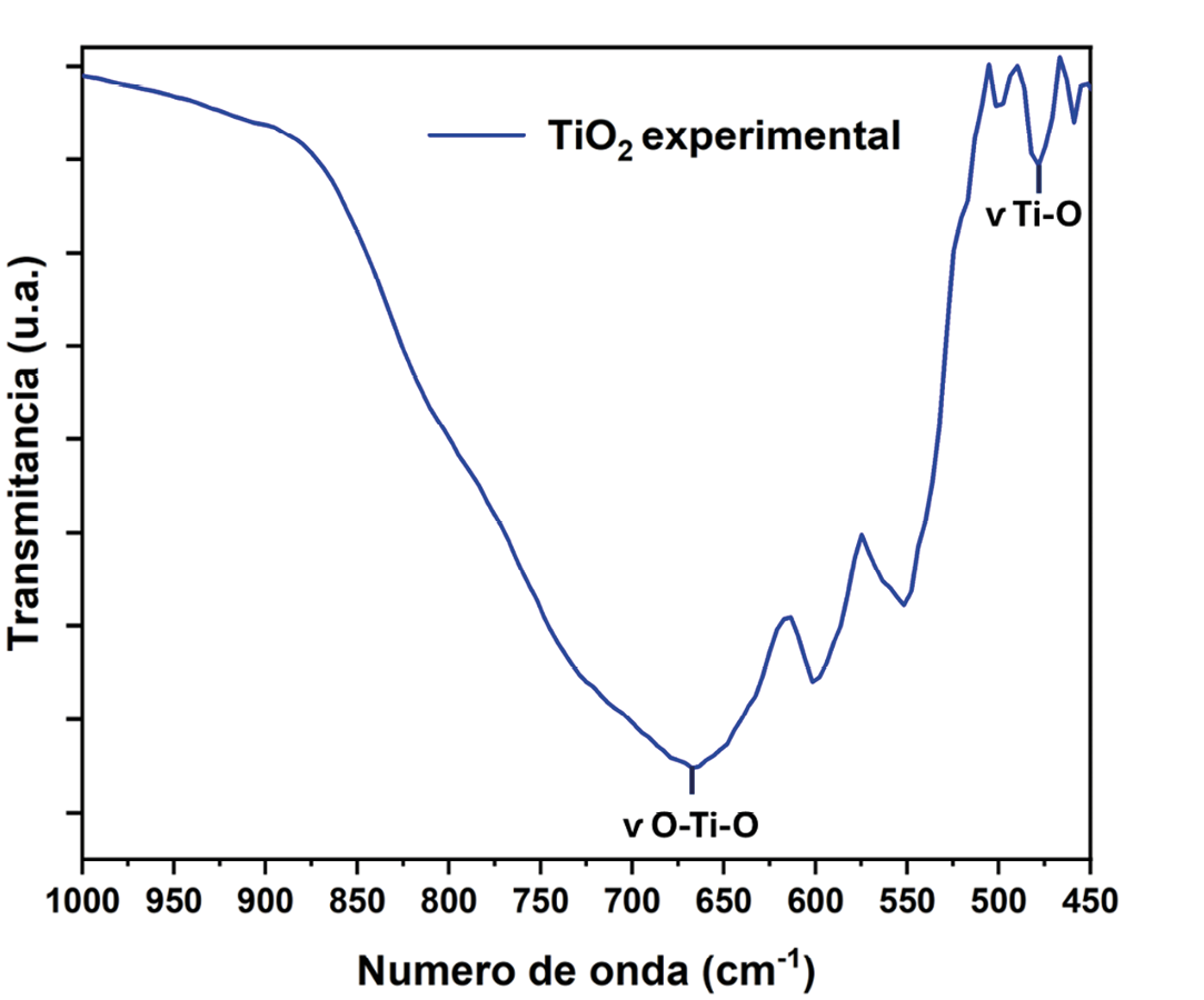 La anatasa, con simetría tetragonal (grupo espacial D₄h, I4₁/amd), presenta modos vibracionales activos en el infrarrojo en el rango de 640–750 cm⁻¹, asociados con el estiramiento asimétrico de enlaces Ti–O–Ti (Mikrut et al., 2020). Por su parte, el rutilo, también de simetría tetragonal (D₄h, P4₂/mnm), muestra bandas significativas entre 450 y 650 cm⁻¹, correspondientes a los modos de estiramiento de los enlaces Ti–O (Hadjiivanov, 1998). Esta técnica permite corroborar los resultados obtenidos por DRX, ya que la FTIR distingue claramente entre estas dos fases.