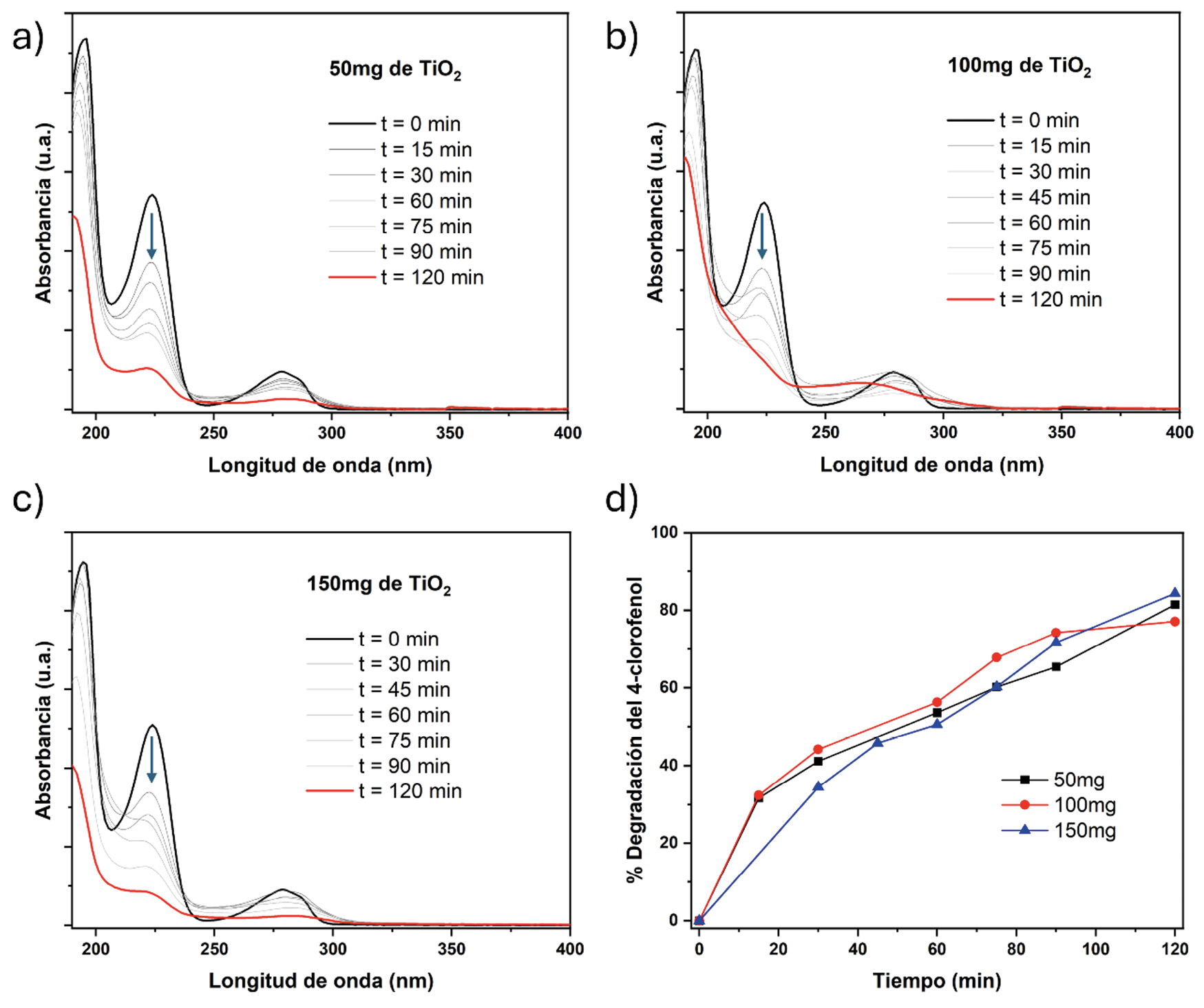 Figura A7. Espectros UV-Vis de la degradación de 4-clorofenol utilizando diferentes masas de TiO₂: a) 50 mg; b) 100 mg; c) 150 mg; d) porcentaje de degradación de 4-clorofenol a tiempos de 15, 30, 45, 60, 75, 90 y 120 minutos.