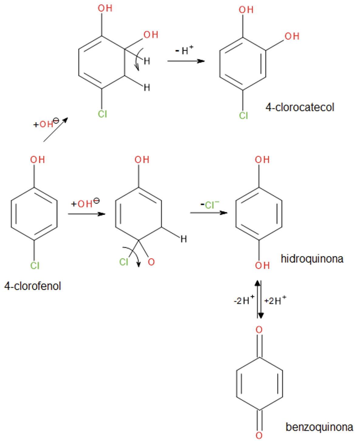 Satuf et al. (2008) realizaron un estudio similar, con la diferencia de que ellos agregaron ácido perclórico a la disolución de 4-clorofenol con TiO₂, ya que un medio ácido favorece la degradación del compuesto. Propusieron que los compuestos intermedios formados durante el proceso son 4-clorocatecol, hidroquinona y benzoquinona (véanse las Figuras A8 y A9).