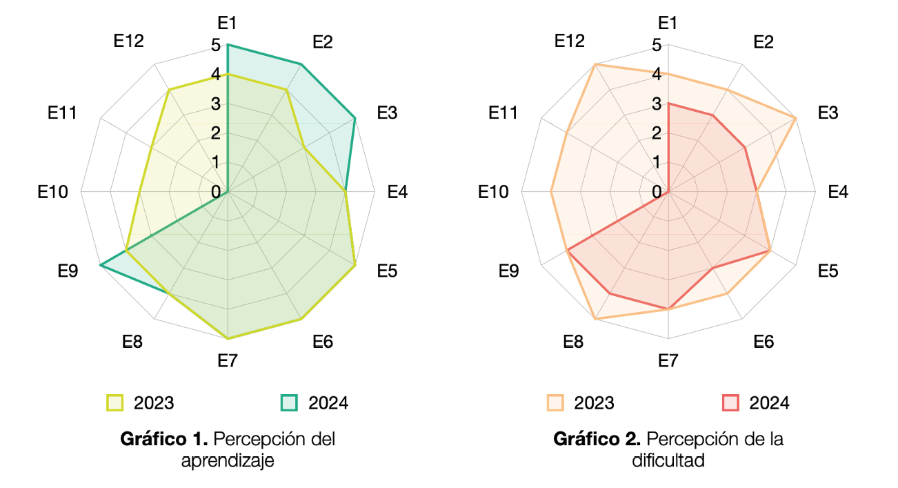 En general, los estudiantes que participaron en 2024 reportaron una experiencia más positiva en comparación con los participantes de 2023. La Figura 3 se divide en dos gráficos, correspondientes a los dos parámetros evaluados: percepción de aprendizaje (Gráfico 1) y dificultad percibida (Gráfico 2).