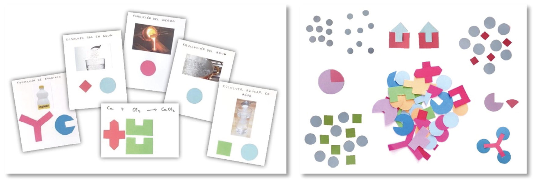 Las principales dificultades de aprendizaje descritas se han tenido en cuenta tanto en la planificación y metodología de las actividades, como en los materiales propuestos. Para cada una de las actividades se han diseñado una serie de cartas y piezas con distintas formas geométricas para que, de forma visual, el alumnado pueda comprender el nivel de interpretación microscópico y sea capaz de relacionarlo con los niveles macroscópico y simbólico. Además, se han presentado las ecuaciones químicas en niveles de complejidad creciente (Dori y Hameiri, 2003).