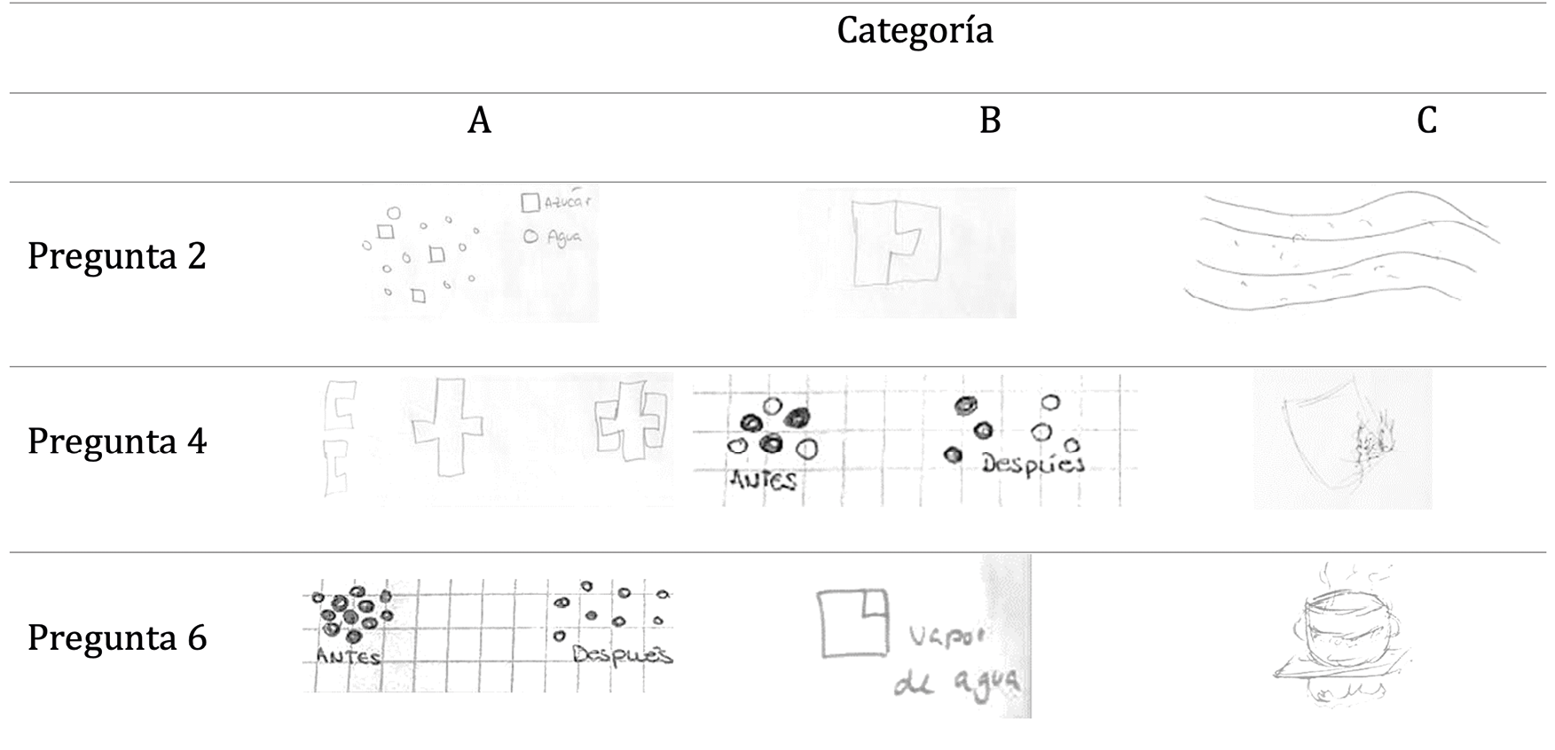Las respuestas a las preguntas 1, 3, 5 y 7 consistían en explicitar lo que ocurre a nivel microscópico en los cambios físicos y químicos, por lo que se han clasificado en tres categorías de mayor a menor nivel de adecuación: A) la explicación es correcta y completa, B) el alumnado demuestra tener conocimiento, pero la justificación no es correcta o completa; y C) la explicación es incorrecta o incompleta. En las preguntas 2, 4, 6 y 8 se solicitaba representar los cambios físicos y químicos a nivel microscópico en tres categorías, de mayor a menor nivel de adecuación: A) representa el nivel microscópico, utilizando adecuadamente la propuesta, B) representa el nivel microscópico y utiliza incorrectamente la propuesta, y C) no lo representa desde el punto de vista microscópico.