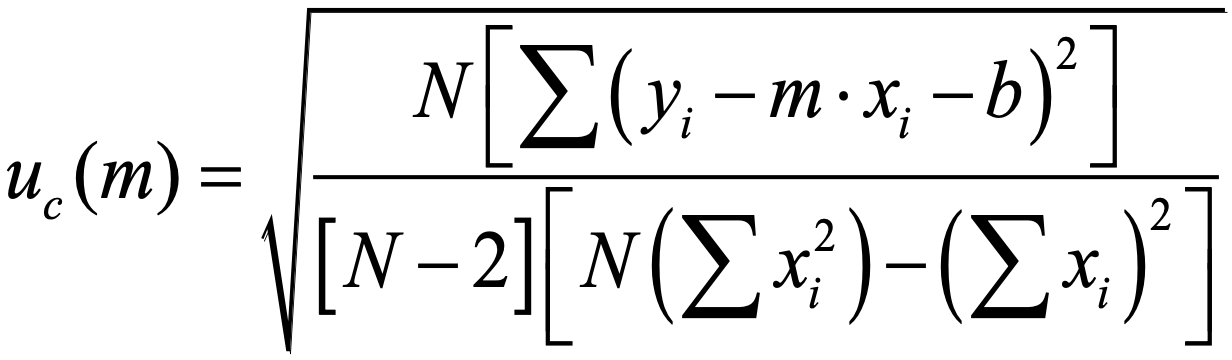 Con ayuda de la Eq. 22 es posible realizar un ajuste lineal aplicado al conjunto de los N pares de datos experimentales (xi, yi) de ln K vs 1/T, a través el método de los cuadrados mínimos (Miller, J. N. et al., 2005; GUM JCGM 100, 2008; VIM JCGM 200, 2012). Las ordenadas yi corresponden a ln K, en tanto que las abscisas xi a , de tal manera que la pendiente m será −Δhr0/R, mientras que la ordenada al origen b, será igual a Δsr0/R. Estos valores pueden calcularse respectivamente como (Miller, J. N. et al., 2005; Williams A., 1995):
