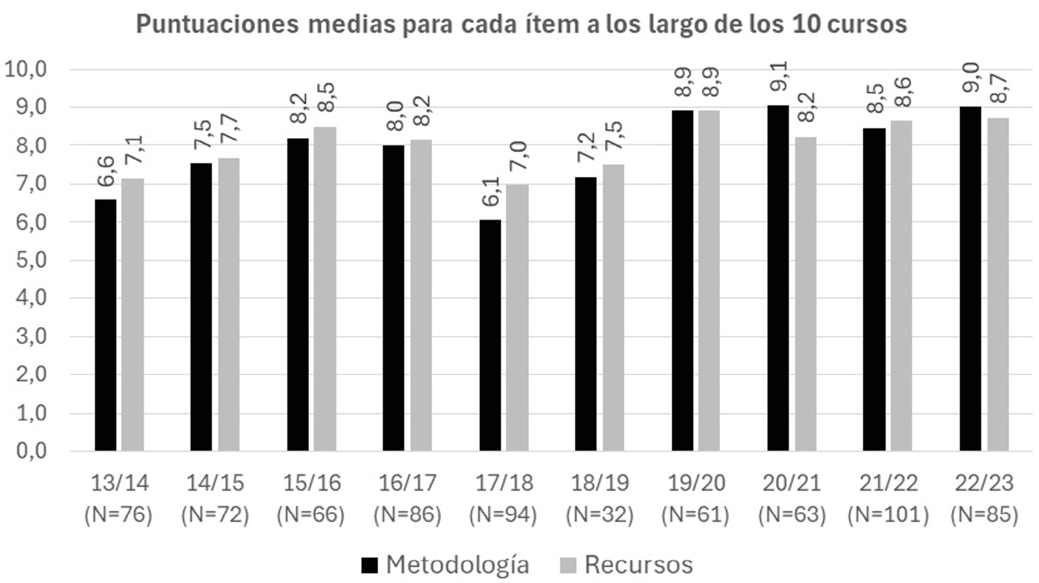 Por parte del alumnado, la metodología y los recursos didácticos se evalúan mediante encuestas de opinión establecidas en la UPV, con carácter totalmente anónimo. Dado que los OAs presentados en este trabajo son el elemento esencial de la metodología desarrollada, pueden considerarse representativas las valoraciones de los siguientes ítems: