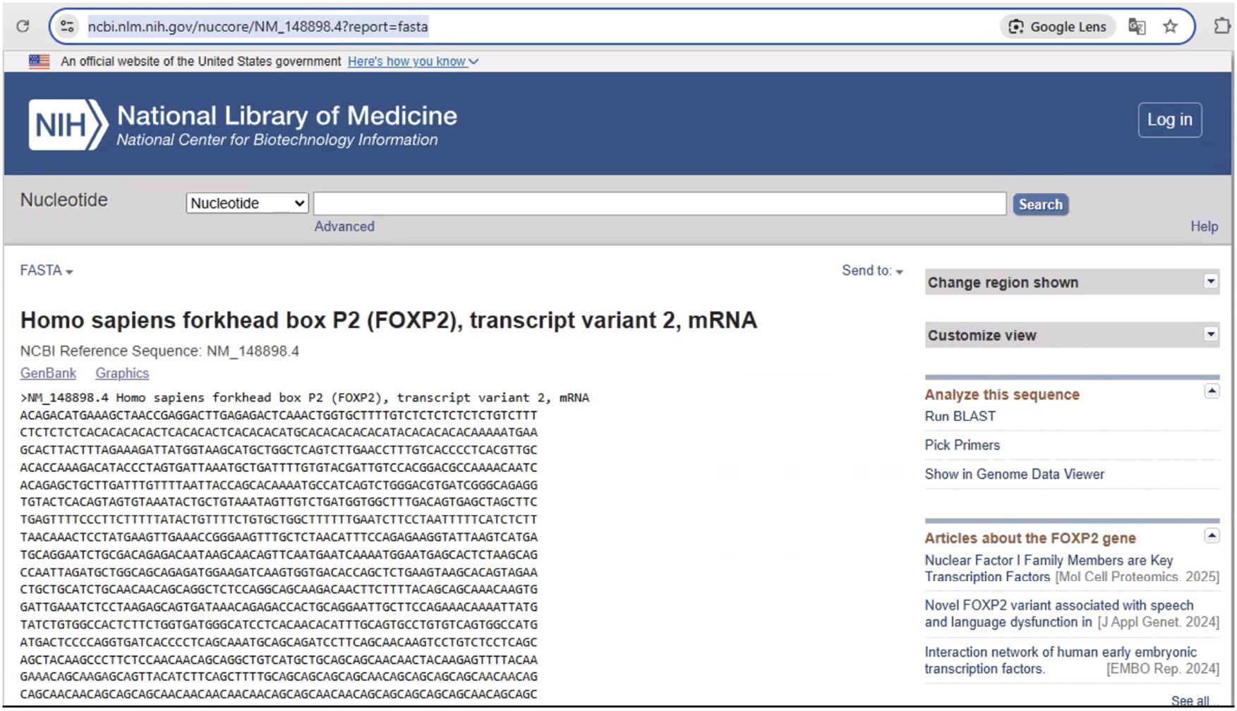 Para el desarrollo de esta secuencia didáctica, se trabajó con estudiantes de quinto año, seleccionando el gen FOXP2 (NM_148898.4 en NCBI, nucleotide) debido a su papel fundamental en el desarrollo del aprendizaje del lenguaje articulado, un proceso biológico de gran relevancia y fácil comprensión para los estudiantes.