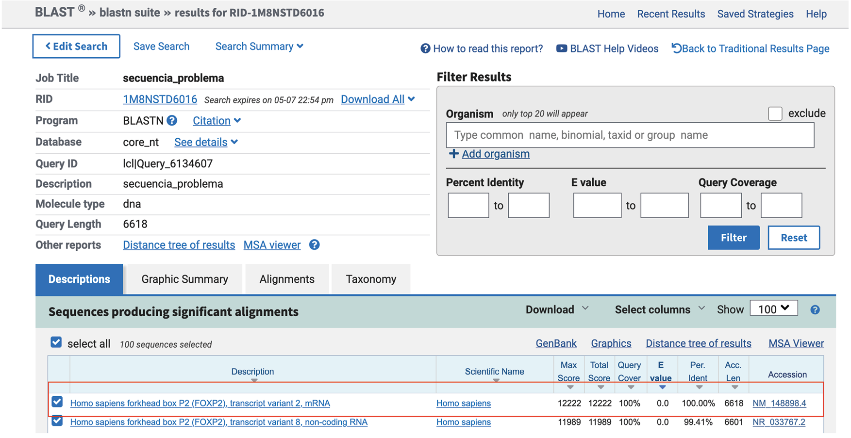 Figura 3. El BLASTN compara la secuencia de FOXP2 con otras secuencias nucleotídicas para encontrar regiones de similitud.