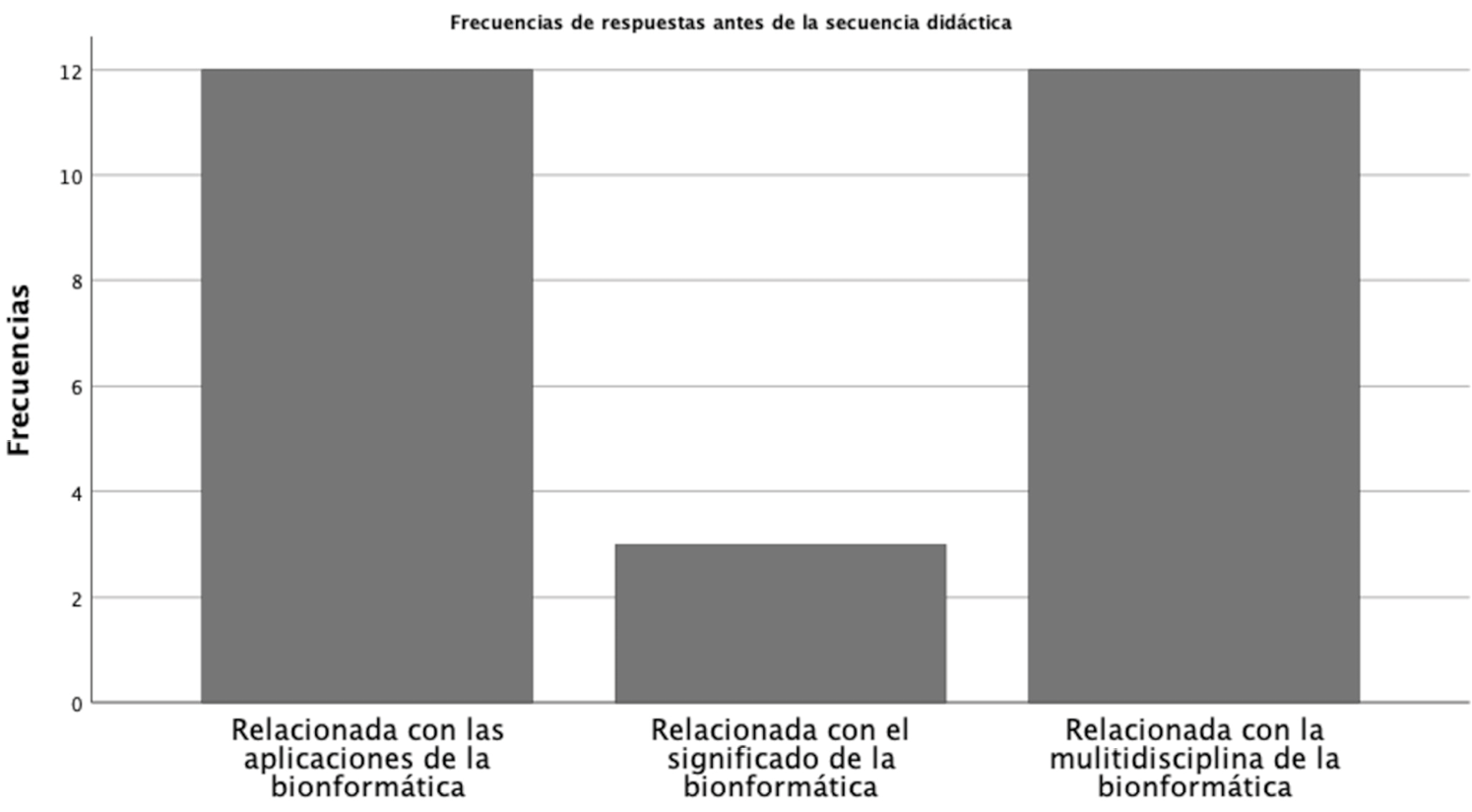 Figura 5. Frecuencias de las categorías de respuestas abiertas sobre “¿Sabes qué es la Bioinformática y cómo puede mejorar la calidad de vida de las personas?” antes de aplicar la secuencia didáctica.