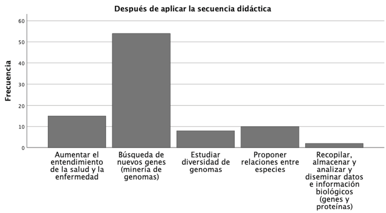Figura 6. Frecuencias de las categorías de respuestas abiertas sobre “¿Sabes qué es la Bioinformática y cómo puede mejorar la calidad de vida de las personas?” después de aplicar la secuencia didáctica.