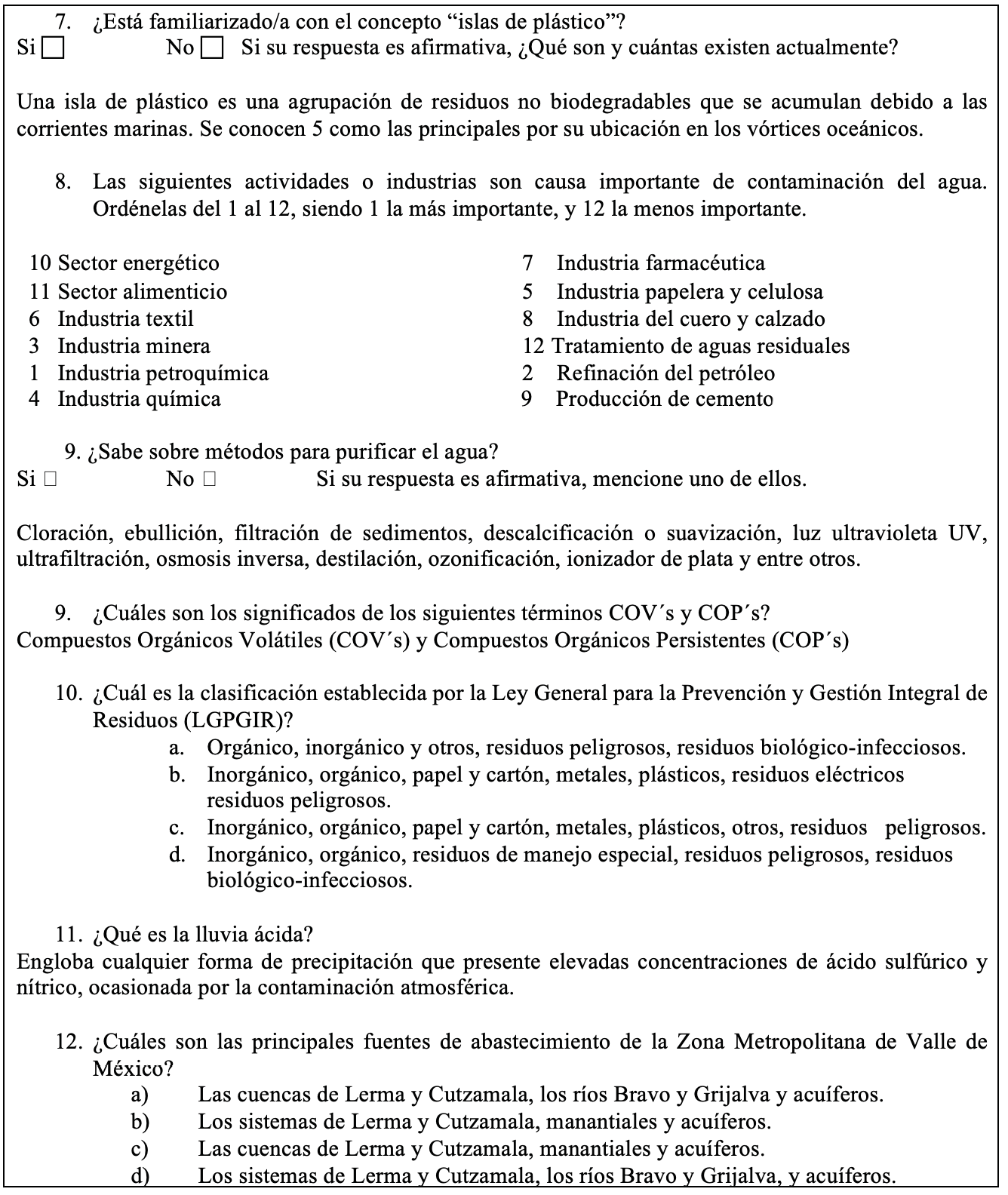 La creación de los ejercicios se basó en una encuesta en la Facultad de Química de la UNAM con una muestra representativa de 100 estudiantes y 40 profesores. El propósito fue explorar sus conocimientos sobre el ambiente y el agua, tomando en cuenta que, como profesionistas y futuros químicos, su formación tiene un impacto significativo en el entorno y, por lo tanto, deben tener una conciencia cabal sobre estos temas. Se diseñaron dos encuestas anónimas idénticas salvo por la sección inicial. En la Figura 1 se muestra la encuesta de 15 preguntas realizada a profesores y en la Figura 2, la sección inicial que difiere y que corresponde a la encuesta realizada a los estudiantes. Además de las preguntas, el cuestionario presenta en rojo las respuestas correctas.
