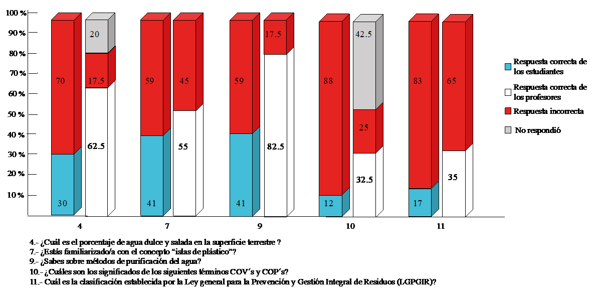 Los resultados de la encuesta mostraron que el 60 % de los estudiantes desconocen el significado o propósito de la Agenda 2030, un plan de acción que engloba las problemáticas ambientales, sociales y económicas. Además, el 66 % de los estudiantes no conoce la existencia de un grupo ambiental en la Facultad de Química (ConCiencia 2030), lo que resulta paradójico dado que más del 80 % considera que la Facultad podría apoyarlos en la adopción de prácticas más ecológicas. En cuanto a los conocimientos sobre el agua, el 57 % de los estudiantes desconocen el concepto de “islas de plástico”, y el 60 % desconoce algún método de purificación del agua. Sin embargo, más del 80 % conoce el término “lluvia ácida” y tiene claro los compuestos presentes en este fenómeno. Por otro lado, los profesores demostraron un mayor conocimiento en comparación con los alumnos. El 83 % de los profesores respondió correctamente que la agricultura y la ganadería son los sectores con mayor consumo de agua, y el 90 % comprende el fenómeno de la lluvia ácida y sus causas. Es de llamar la atención que ni los estudiantes (88 %) ni los profesores (67.5 %) tienen conocimiento sobre Ley General para la Prevención y Gestión Integral de Residuos (LGPGIR). En ese sentido, la Facultad de Química podría emprender acción y organizar cursos y talleres para concientizar a su planta docente. En la Figura 3 se presentan estos resultados de manera desglosada.