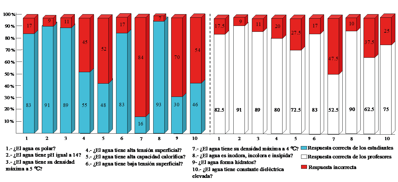 En la Figura 4, se presentan los resultados de la pregunta 6, que son de trascendental importancia pues son las relativas a la disciplina. En ese sentido, la pregunta 6 aborda cuestiones fisicoquímicas del agua, información que un estudiante de la Facultad de Química debe conocer y dominar. Sin embargo, los resultados muestran que hay mucho trabajo por hacer desde el punto de vista del conocimiento. Las preguntas 7 (16 %), 9 (30 %), 10 (46 %), 5 (48 %) y 4 (55 %) son, en ese orden, las peor contestadas. Los tópicos involucran la densidad del agua a cierta temperatura, su capacidad calorífica, su tensión superficial, su reactividad y su constante dieléctrica. Estos resultados son preocupantes pues el 70 % de los encuestados ya cursó el ciclo de Tronco Común en la Facultad de Química. De forma general, los profesores responden mucho mejor este apartado. El detalle de los resultados de las encuestas se puede consultar en la información suplementaria de este manuscrito.