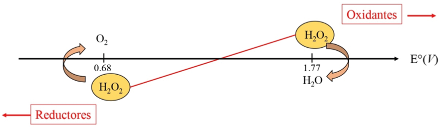 El peróxido de hidrógeno, H2O2 es un agente oxidante altamente reactivo utilizado en diversas aplicaciones, incluyendo la desinfección agrícola y el tratamiento de aguas. Sin embargo, el peróxido de hidrógeno es un compuesto inestable y tiende a descomponerse lentamente a temperatura ambiente en agua y oxígeno molecular. Explica su reactividad a partir de la escala de potencial estándar de reducción, el cálculo de la constante de equilibrio para su dismutación y la determinación de la energía libre de Gibbs asociada al proceso, ΔGº. Para ello considera que la ecuación del proceso:
