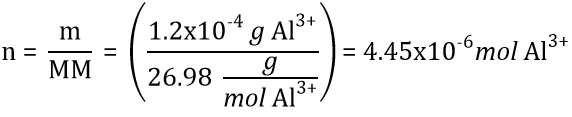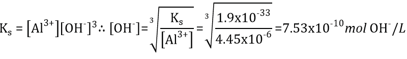 Considera que la constante de solubilidad del hidróxido de aluminio, Al(OH)3, es Ks = 1.9x10-33, que 1 ppm corresponde a 1000 ppb y que la ecuación que representa la transformación es: