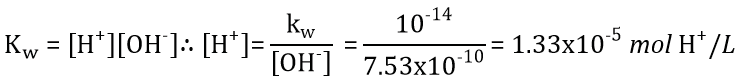 pH = -log[H+] = -log[1.33 x10-5] = 4.88