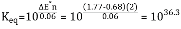 2.- Se calcula la constante de equilibrio, que relaciona el número de electrones intercambiados en la reacción redox presente y la diferencia de potencial de celda.