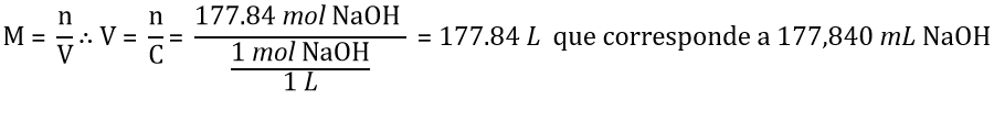 Se determina el volumen de hidróxido de sodio a partir de la ecuación de molaridad que relaciona la cantidad de sustancia con el volumen.