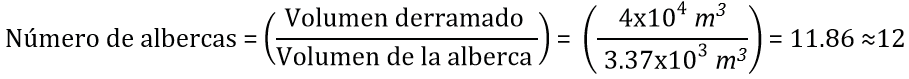 A partir del volumen que tiene una alberca es posible determinar la cantidad de albercas necesarias, considerando que el volumen derramado fue de 40 mil m3.