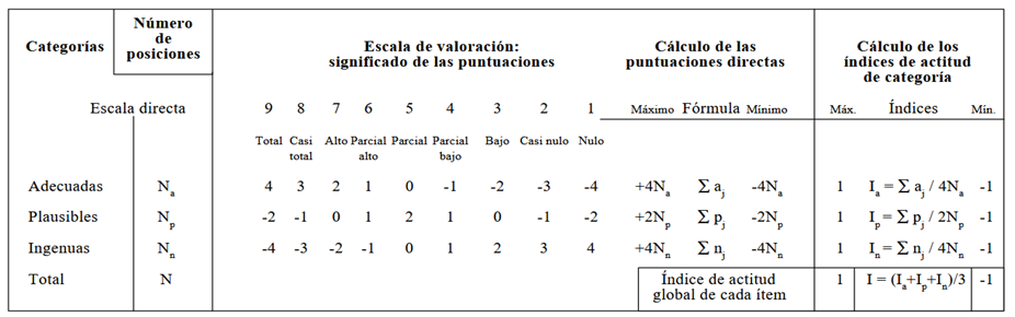 ∑: suma de las puntuaciones directas de j = 1 a j = Na (j = Np o j = Nn) para el conjunto de oraciones pertenecientes a cada una de las categorías «Adecuado», «Plausible» o «Ingenuo».