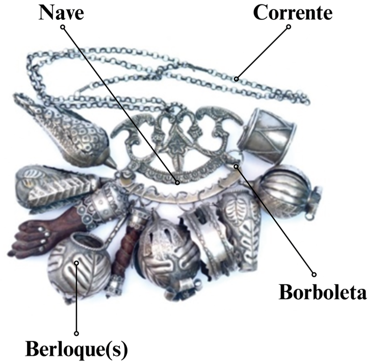 A corrente, como representado na Figura 3, era responsável por fixar o amuleto ao corpo da usuária. A nave, com formato semelhante ao de um pequeno navio, possuía um compartimento dentado no qual os berloques eram inseridos e organizados. Esses berloques, por sua vez, refletiam elementos de fé, ancestralidade e gosto pessoal, variando em número, forma e significado, com a possibilidade de repetição. A borboleta era o elemento que abria a nave e possibilitava o encaixe dos pendentes (Carmo, 2016).